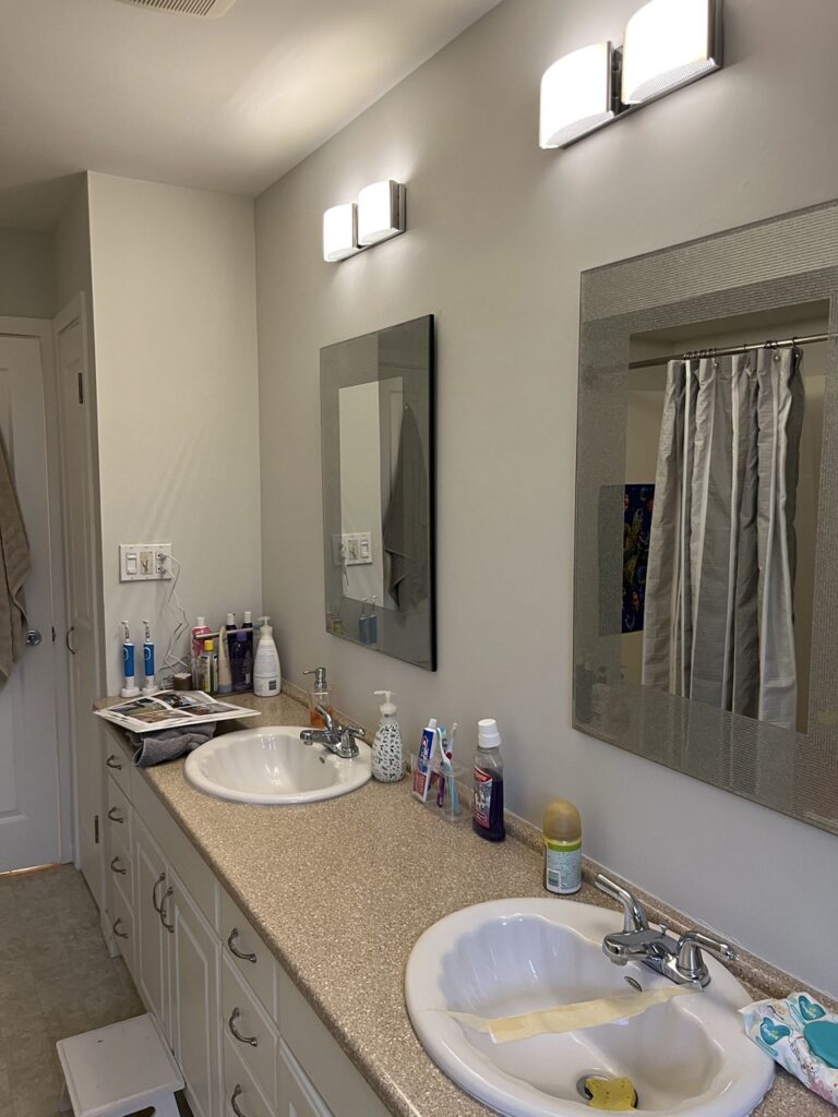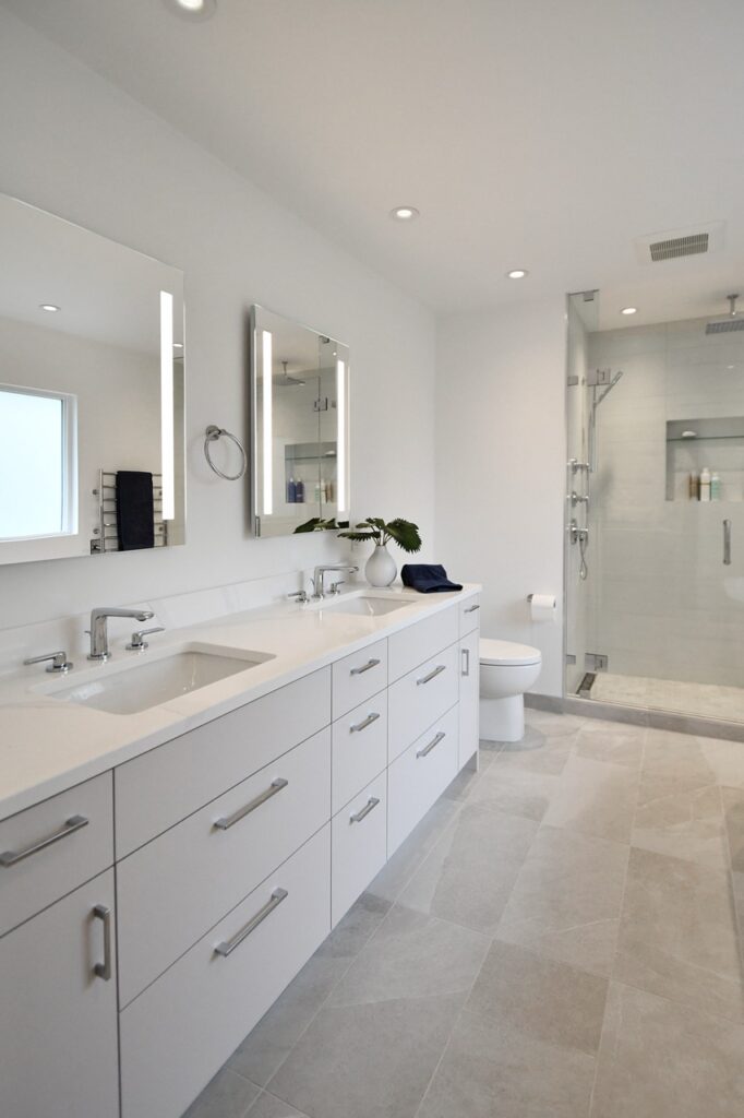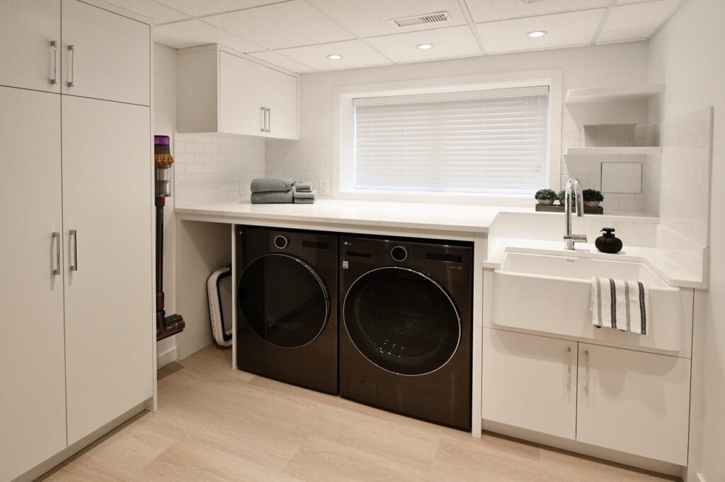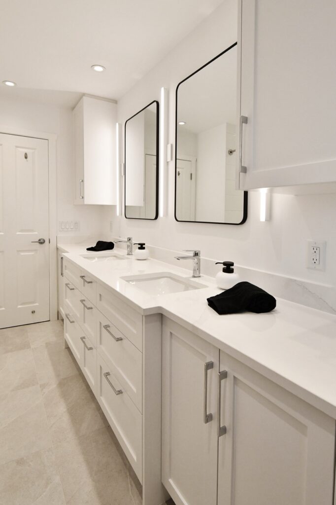 - This comprehensive renovation transformed an 80’s home with thoughtful updates to the main bath, laundry, garage, entry, and primary suite. The main bathroom was refreshed with modern fixtures, smart storage solutions, and a cabinet design to break up the space visually. A spacious new ensuite was created, doubling in size to include a two-sink vanity, freestanding soaker tub, walk-in shower with bench, heated floors, and individual lit anti-fog mirrors.